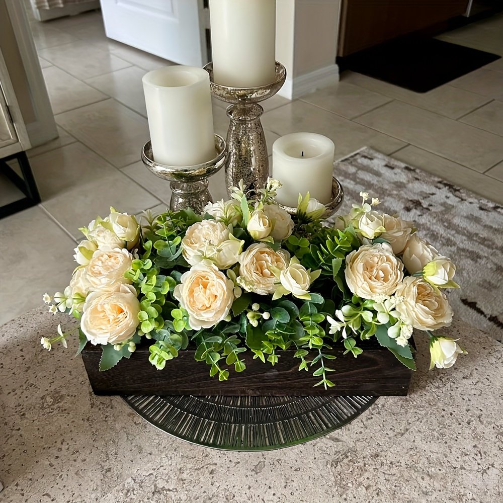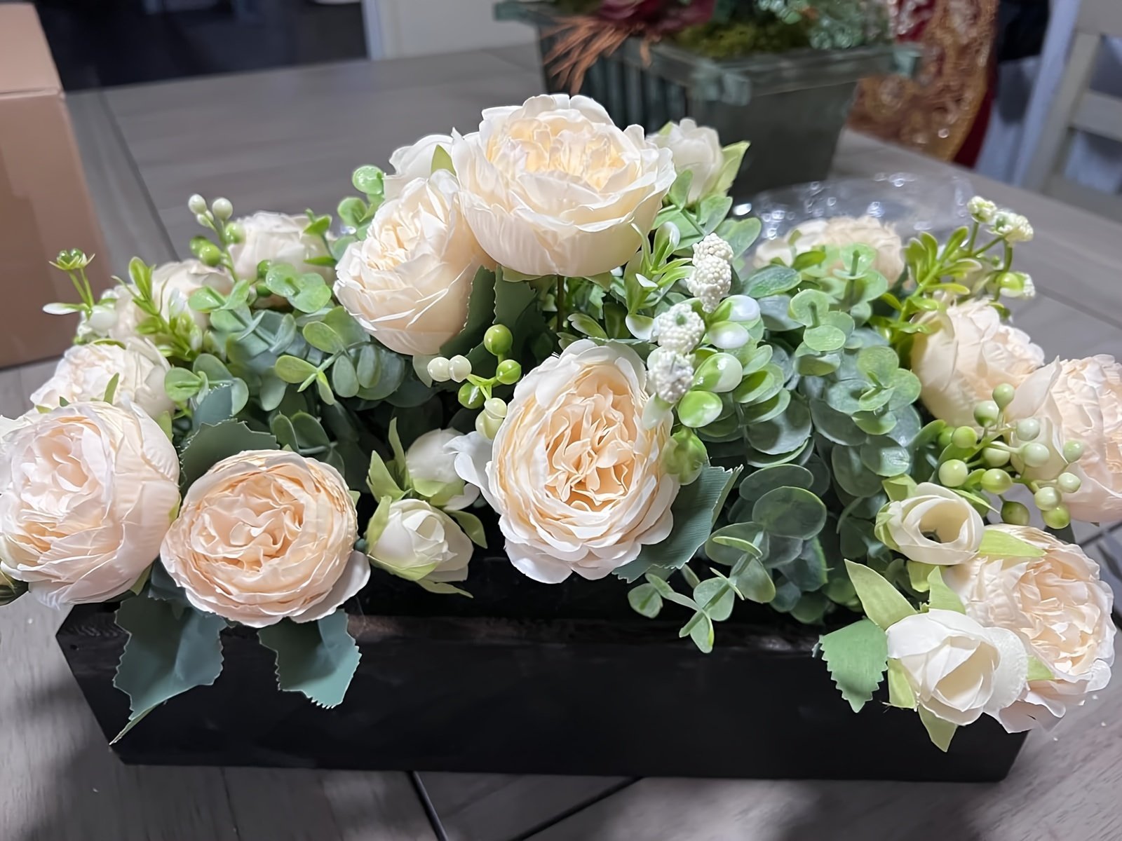 This set of dining table decor is beautiful artificial flowers and eucalyptus leaves, with classic wooden boxes, is the best spring summer center decoration for kitchen, dining table, living room, coffee table decoration.